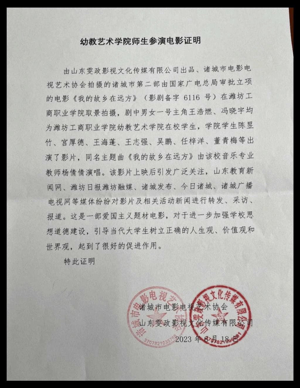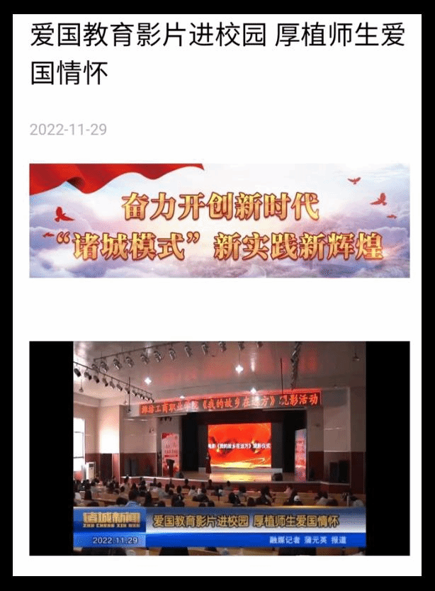由幼教艺术学院师生主演的爱国教育影片《我的故乡在远方》上映后引发广泛关注。山东教育新闻网、潍坊日报潍坊融媒、诸城发布、今日诸城、诸城广播电视网等媒体纷纷对影片及相关活动新闻进行转发、采访、报道。11月21日,《山东教育报》第四版刊发《潍坊工商职业学院师生参演爱国主义教育影片获好评》,对幼教艺术学院师生主演影片《我的故乡在远方》首映式上的良好反应做了新闻报道。11月10日,诸城市电视台(诸城融媒)新闻频道对我院师生参演电影进行专访;11月29日,以《爱国教育影片进校,厚植爱国情怀》为题对我校组织的观影活动及座谈会做了专题宣传报道。片中男女主角及主题曲均由我校幼教艺术学院师生主演、主唱,男女主角的大学生活、学习场景均在我校取景拍摄。育人的根本在于立德。”近年来,幼教艺术学院坚持用习近平新时代中国特色社会主义思想开展铸魂育人工作,构建新时代高校“大思政”工作格局,培育和引导大学生践行社会主义核心价值观。特别是利用短视频、微电影、影视剧、舞台剧等新媒体思政教育阵地,采取线上与线下、校内与校外、理论与实践相结合的方式,让大学生在亲身参与中接受教育,触发爱国情感,着力打造富有自身特色的思政教育活动成果,取得了实效!