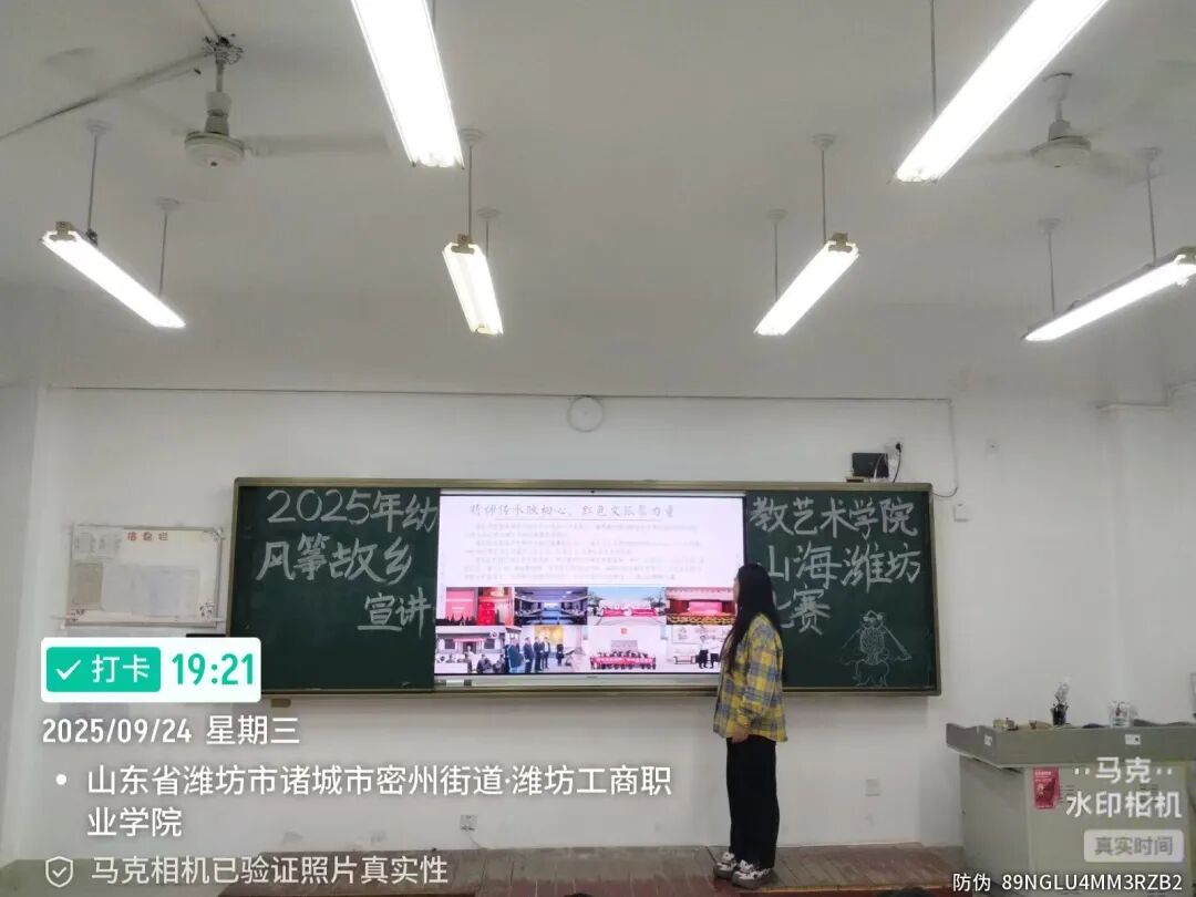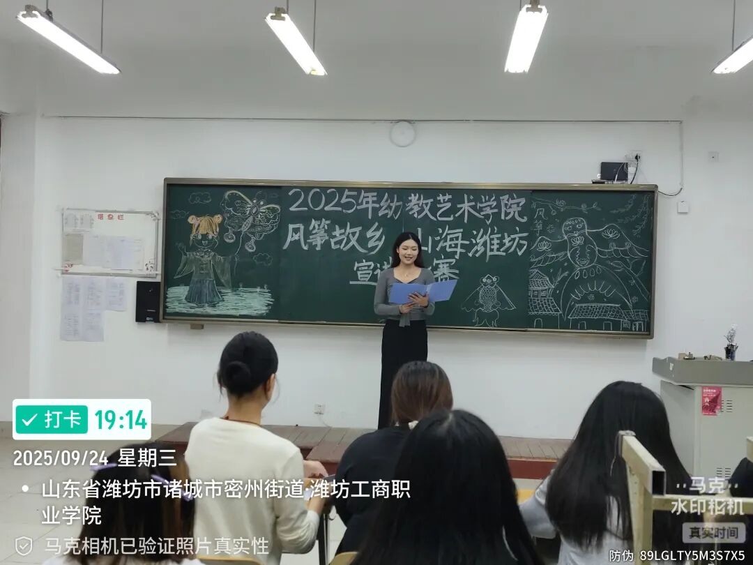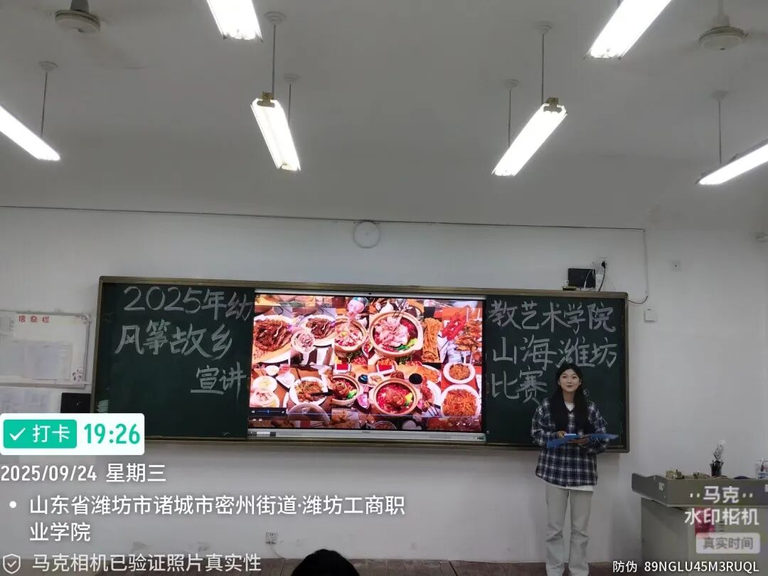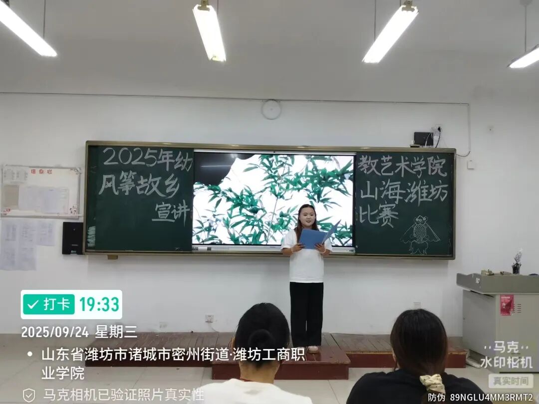 本次“风筝故乡 山海潍坊”主题演讲比赛,吸引了来自幼教艺术学院各个专业、不同班级的众多优秀学子踊跃参与,参赛选手们从多个维度展现了潍坊的城市魅力,比赛中,选手们充分利用PPT、音频、视频等多媒体手段,全方位宣讲潍坊的文化传承、自然景观和城市发展。