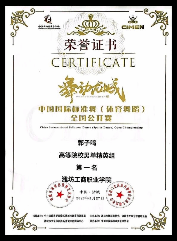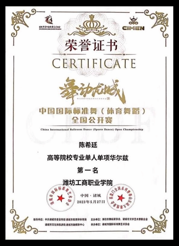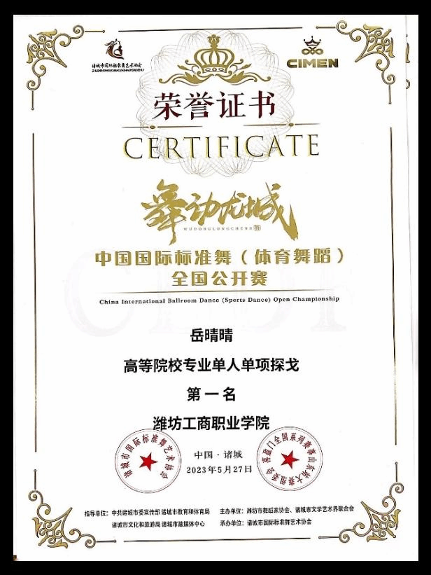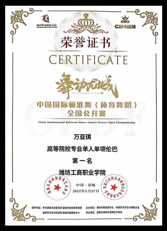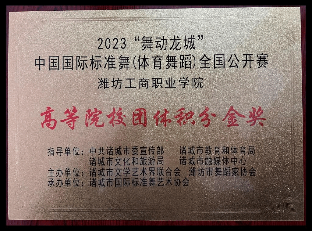 72023“舞动龙城”中国国际标准舞(体育舞蹈)全国公开赛在我市举行,10个地区的选手参加,我院选手在比赛中获奖50项,其中第一名4项,第二名8项,第三名8项,其余名次30项,幼教艺术学院获优秀组织奖、高等院校团体积分金奖。