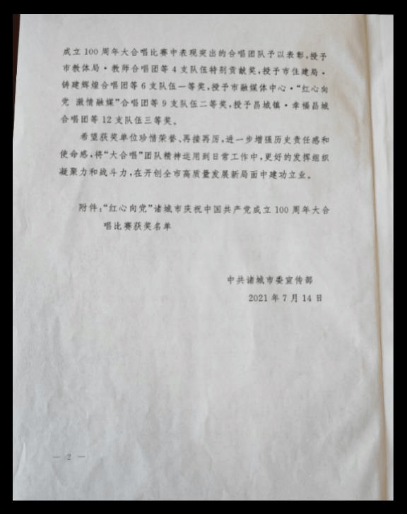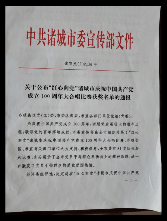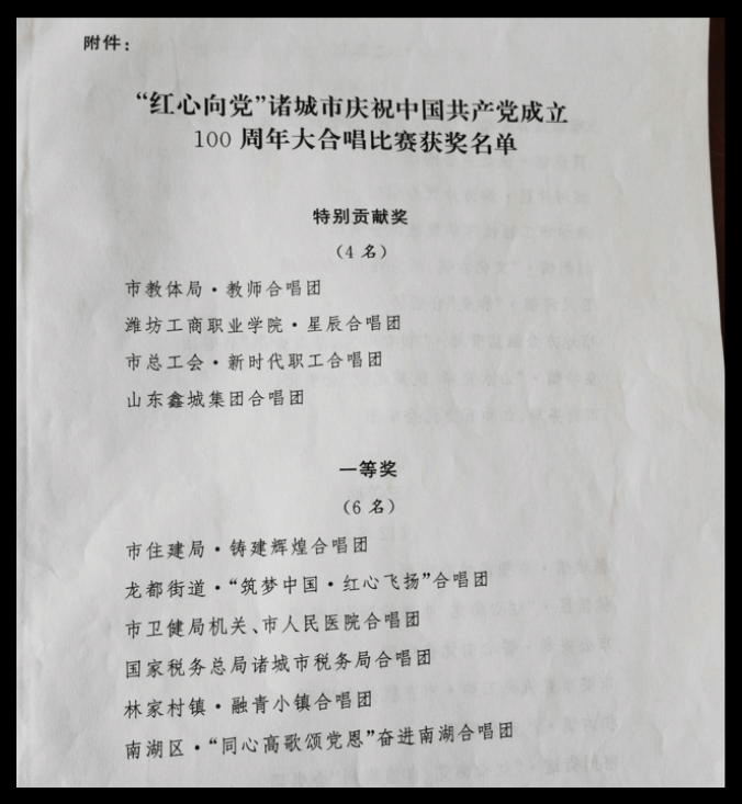 6、2021年“红心向党”热烈庆祝中国共产党成立100周年诸城市合唱比赛我校星辰合唱团获得特殊贡献奖。
