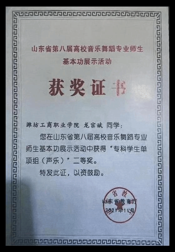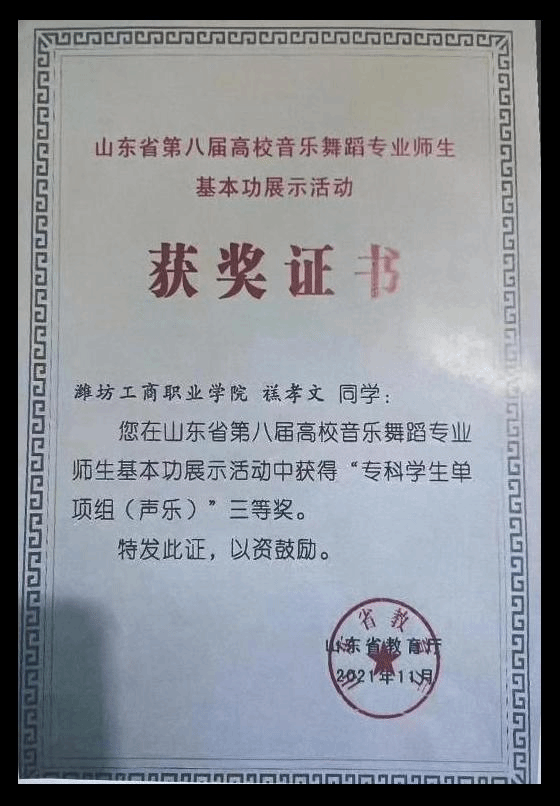 4、2021年山东省职业院校技能大赛声乐表演赛项中我校学生获得省个人三等奖的成绩。