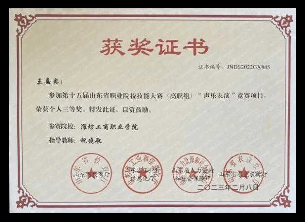 5、2022年山东省职业院校技能大赛声乐表演赛项中我校学生获得省个人三等奖的成绩。