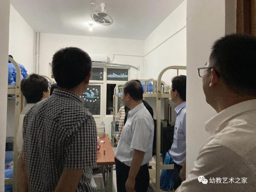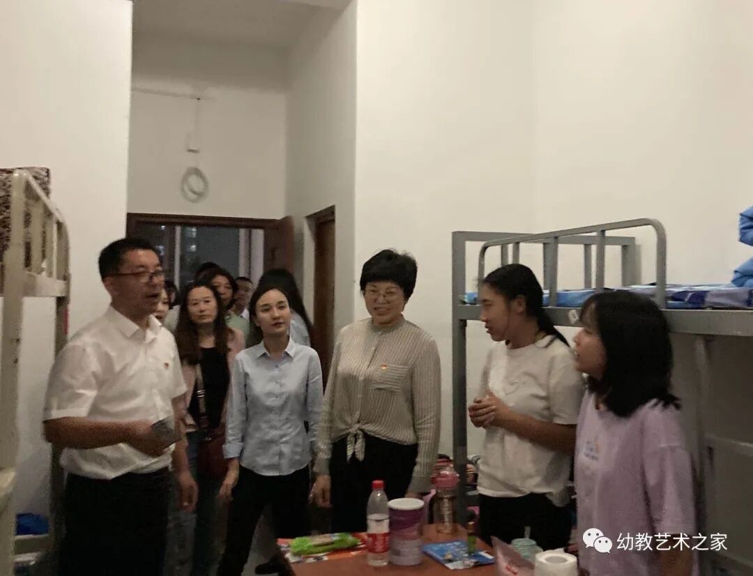 在志愿者的帮助下有序领取完个人用品后,新同学各自回到宿舍。随后,学校主要领导和幼教艺术学院班长成员以及全体辅导员走进新生宿舍看望同学们。