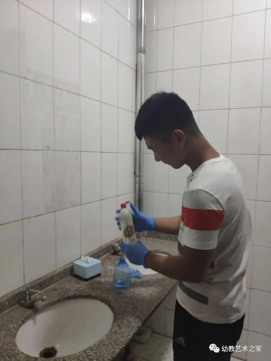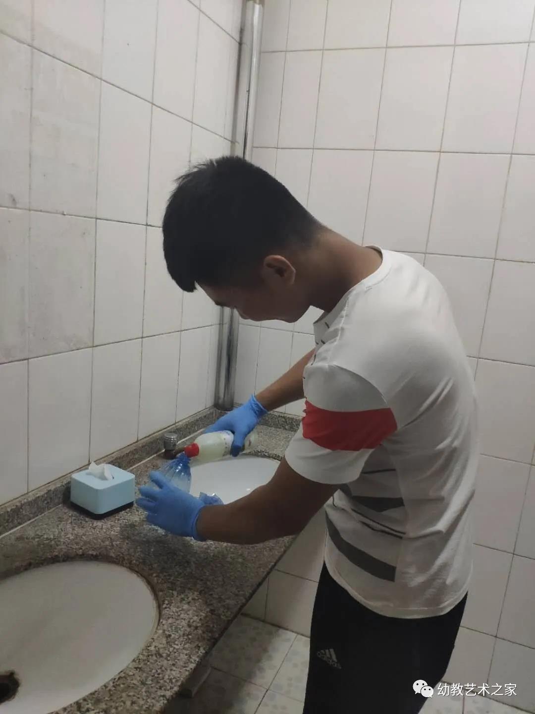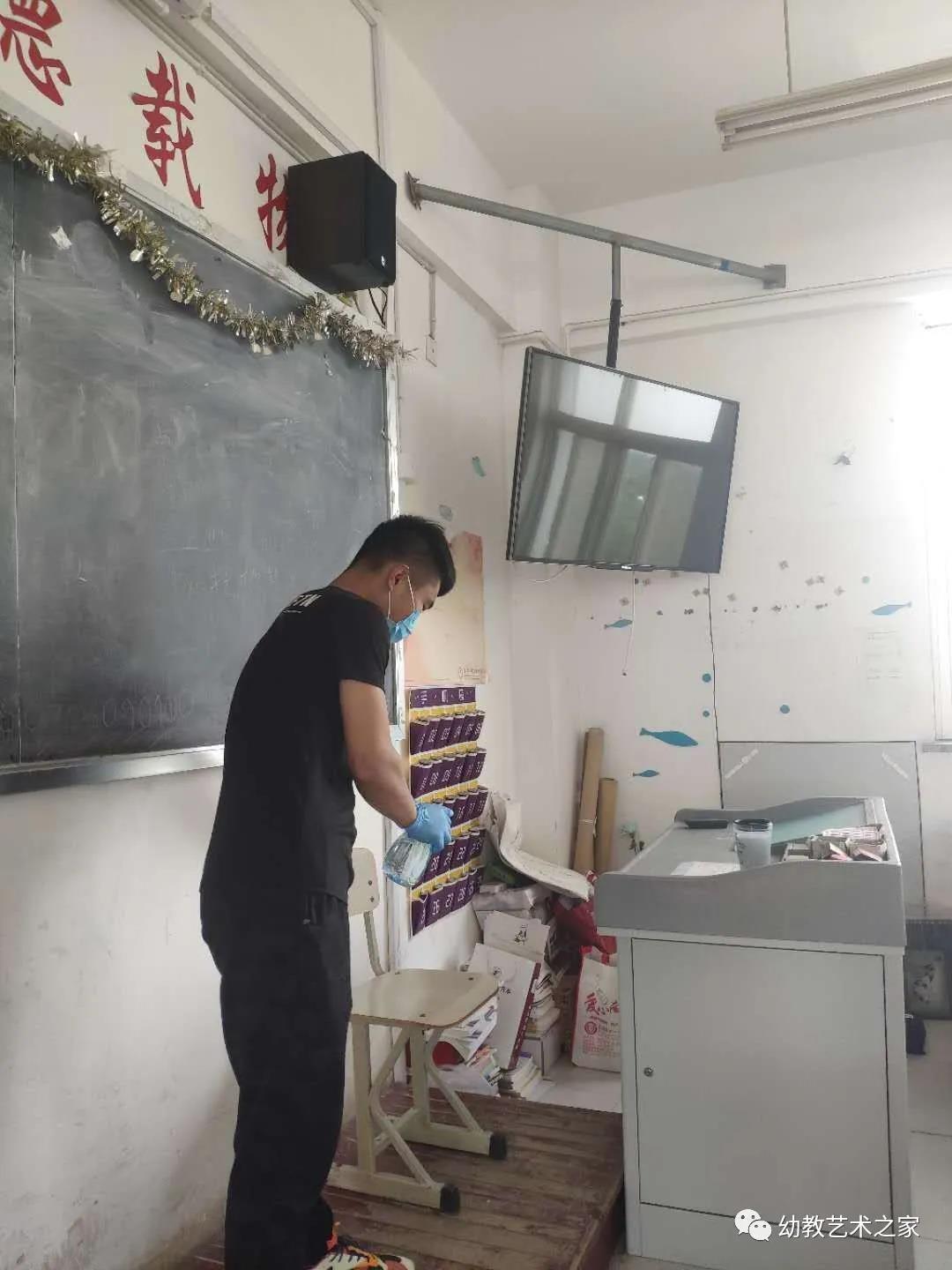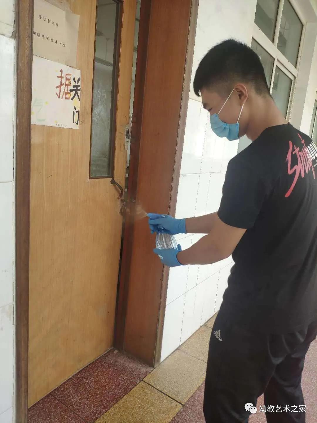 中午和晚上离开教室前消毒员要按比例配好消毒液,在每个角落都进行消毒,最后做好记录。