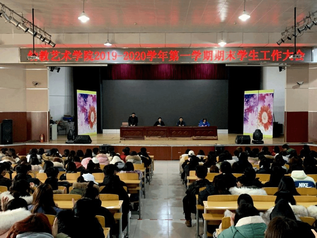 根据学院党委、院委会的要求,于2019年12月26日下午两点在第一报告厅召开幼教艺术学院期末学生大会。参会人员:副院长冯玉香、党支部书记杨明华、团总支书记苏茂刚、教学秘书王建梅以及大一、大二全体辅导员,大二各班班长、团支书,大一全体学生。