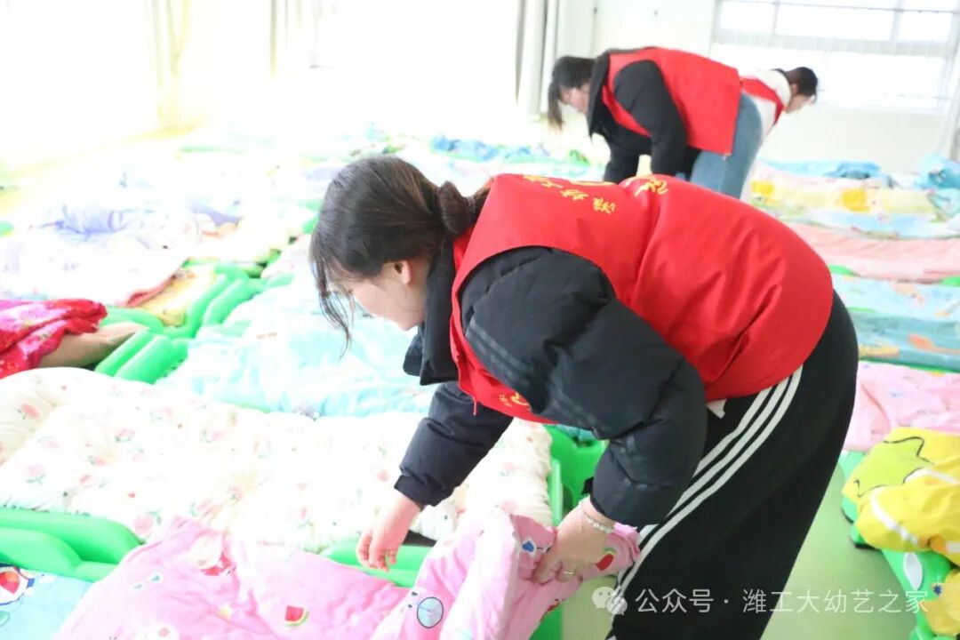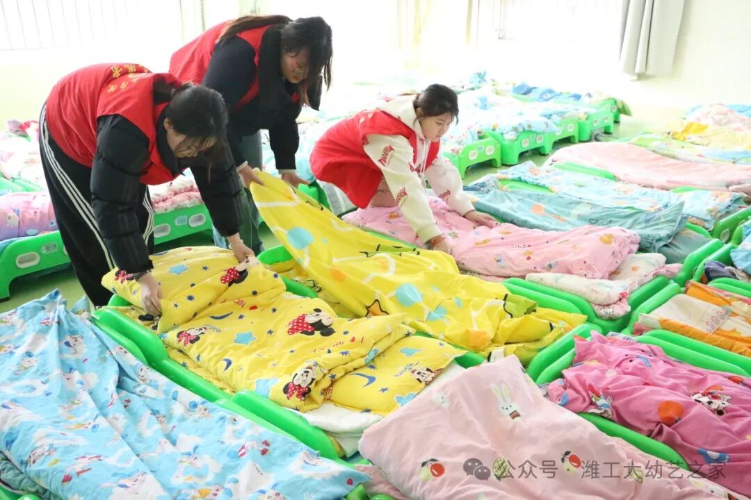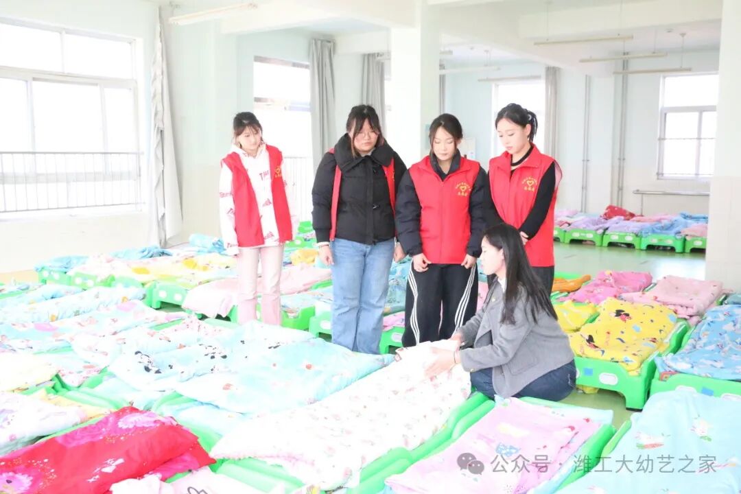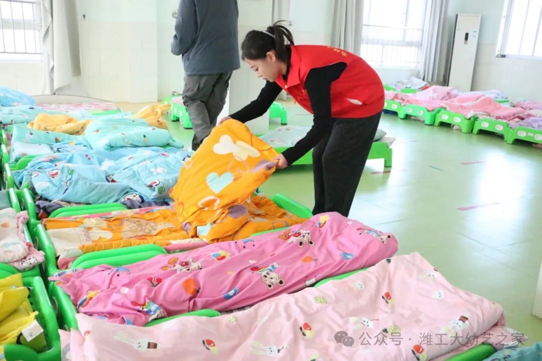 同时,幼儿园的老师们也向同学们传授了给小朋友整理床铺的技巧。在实践中,同学们挨个动手整理,从铺床单到叠被子,每一个步骤都认真对待。叠被子只是一件普普通通的“小事”,但对同学们来说,蕴含着无限的学习契机。只有当课程和生活真正融入在一起,在生活中学习知识,才是教育的本真。