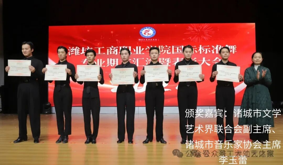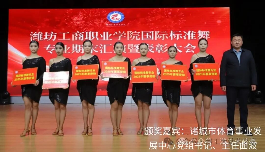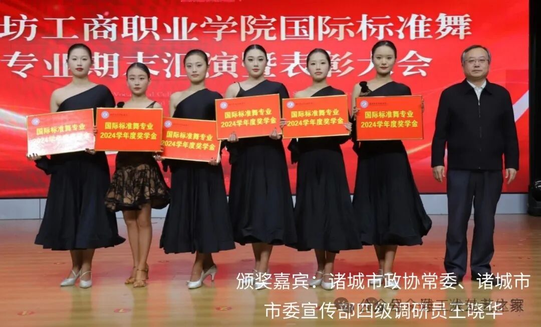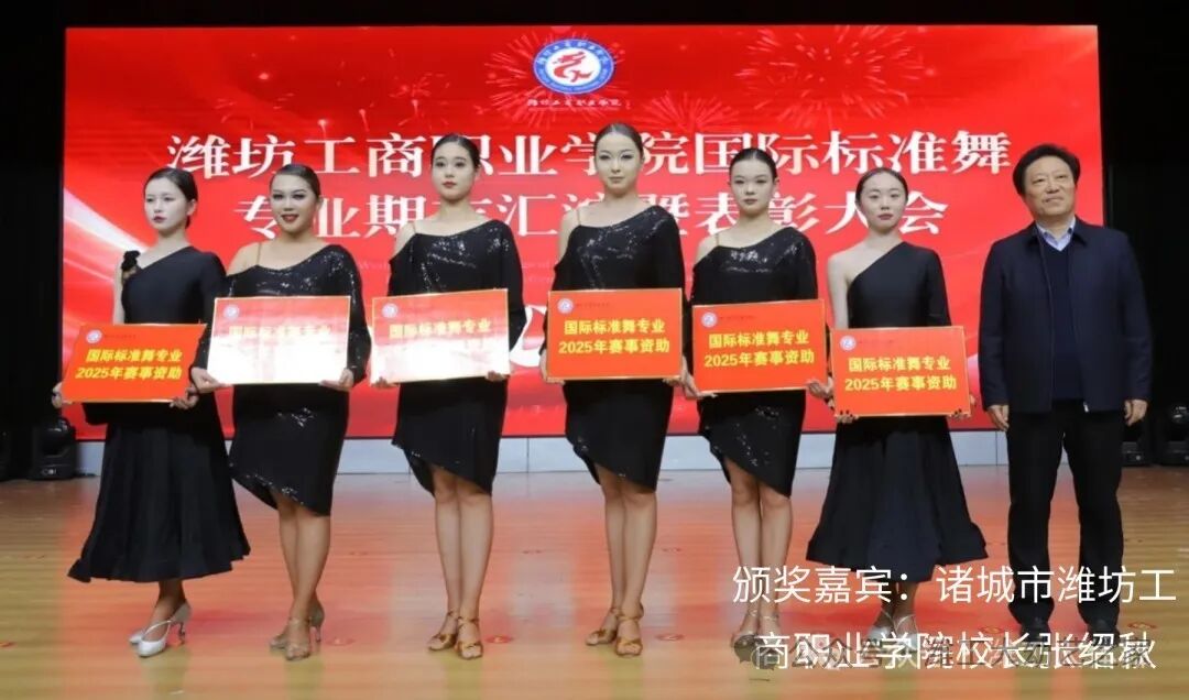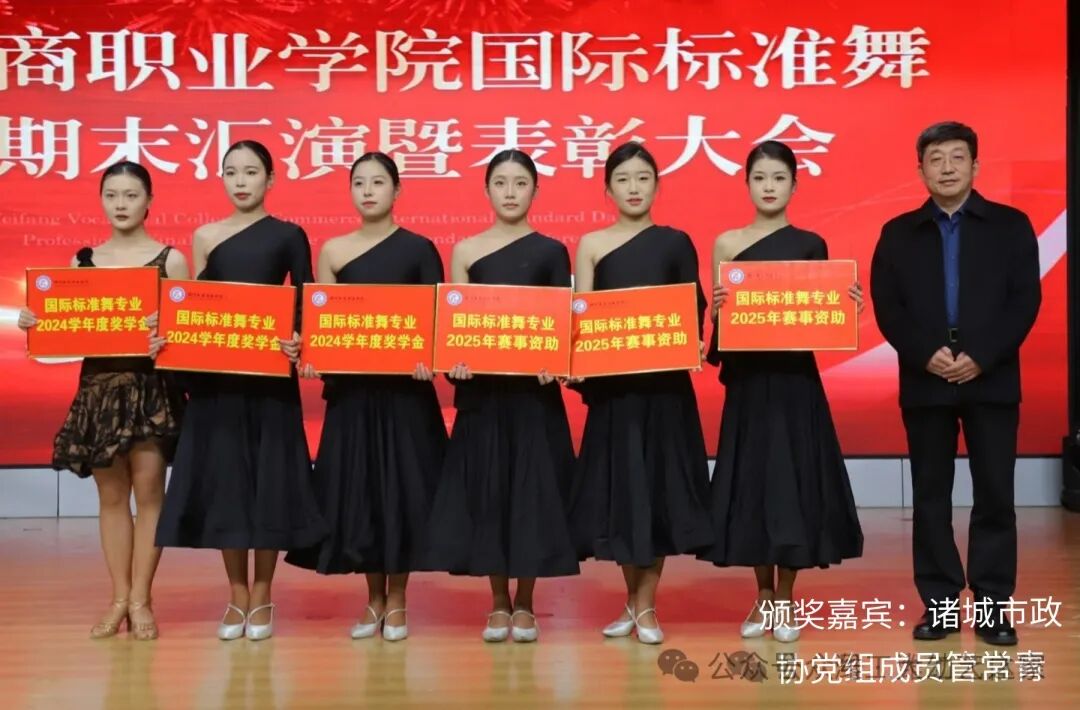 汇演结束,由诸城市艺都国际舞蹈中心资助,给予六名同学颁发奖学金,由诸城市国际标准舞艺术协会赞助,给予23名同学颁发2025年赛事补助,国际标准舞专业授予29名同学颁发了本学期进步奖。