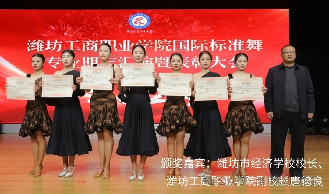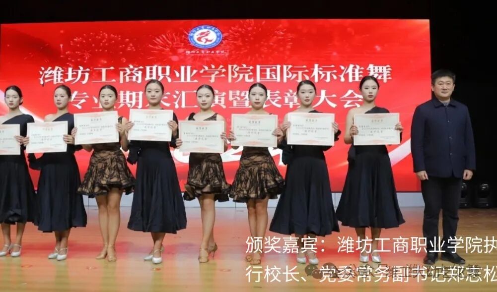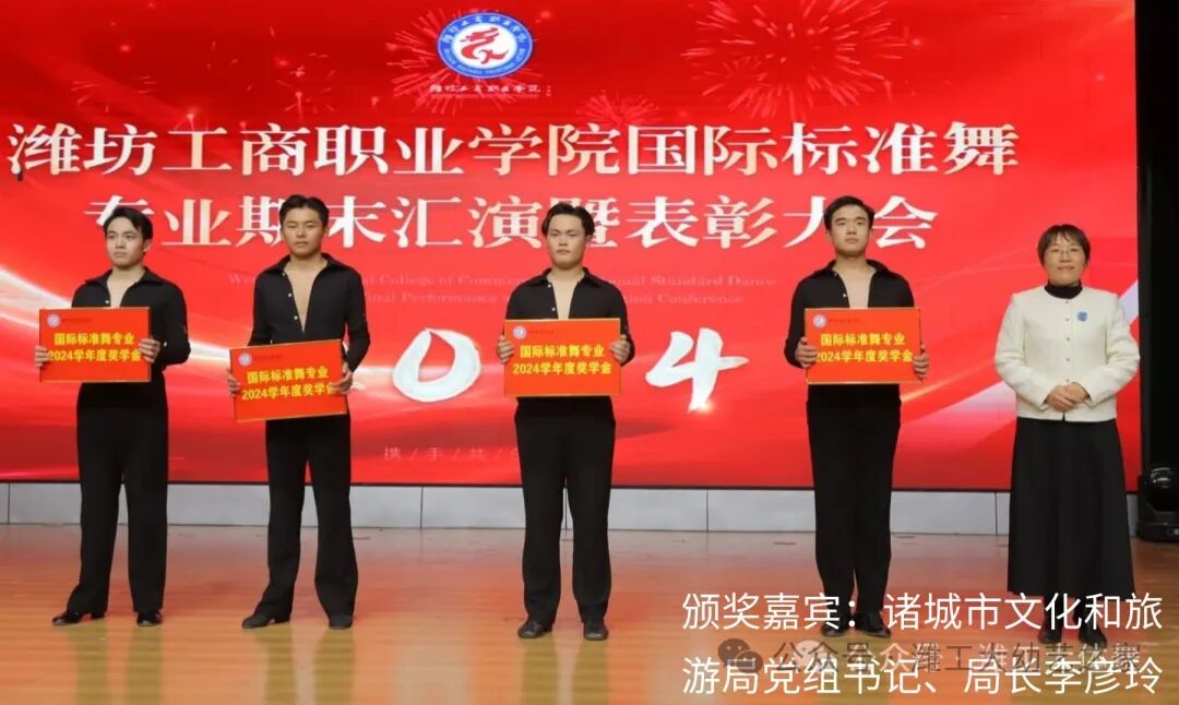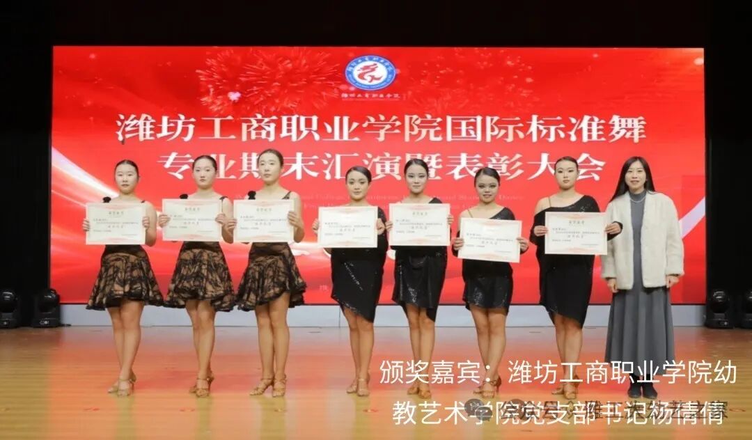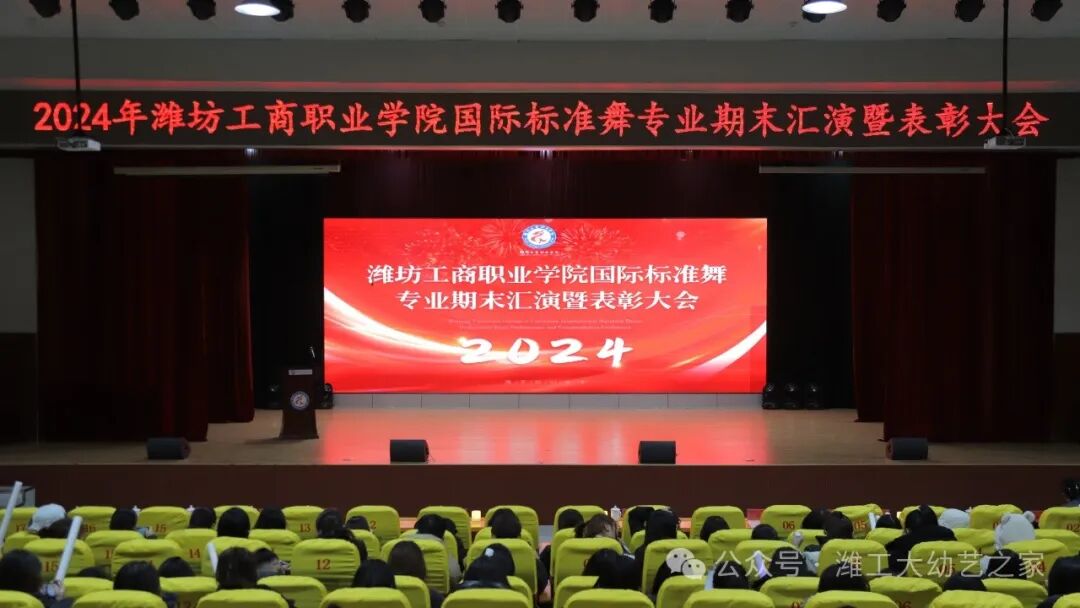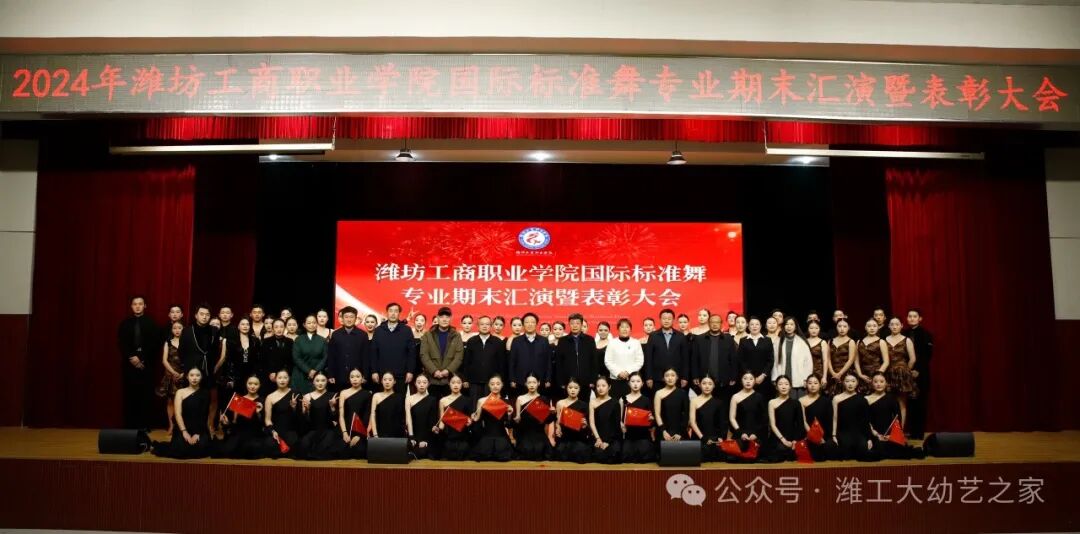2024年12月30日,潍坊工商职业学院幼教艺术学院国际标准舞专业期末汇演暨表彰大会在第一报告厅进行。出席本次活动的领导嘉宾有:市政协党组成员管常青,市委宣传部调研员王晓华,文旅局党组书记李彦玲,体育事业发展中心党组书记曲波,音乐家协会主席李玉蕾,地方史志研究中心主任李明涛,电影电视艺术协会主席常鸣,政协委员、阳光照明电器有限公司总经理王桂萍,国际标准舞艺术协会副主席任敏,校长张绍秋,执行校长、党委常务副书记郑志松,副校长唐德良,幼教艺术学院领导班子以及部分师生代表;活动由专业负责人陈瀚主持,幼教艺术学院院长冯玉香致欢迎词。