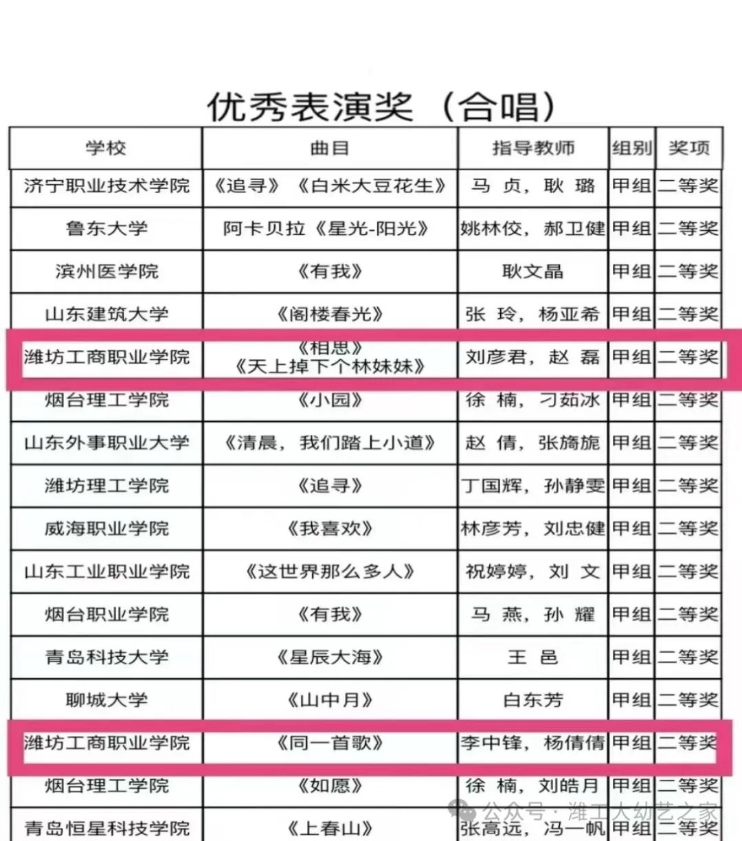 近日,2024年山东省大学生校园艺术节合唱戏剧专项展示活动获奖名单公布。学校高度重视本次活动,认真筹备、积极动员,鼓励学生在比赛实践中提升专业技术能力与艺术表现能力;在领导的大力支持,校团委和幼教艺术学院师生的共同努力下,上报作品:大合唱《相思》、《天上掉下个林妹妹》、小合唱《同一首歌》获得合唱甲组省二等奖;歌剧《白毛女》获得戏剧甲组省二等奖!
