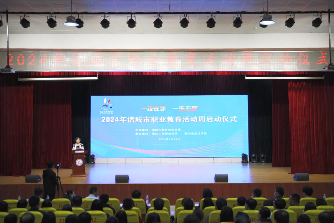 为贯彻落实全国职业教育大会精神,进一步营造全社会关心支持职业教育的良好氛围,我校于5月15日在第一报告厅举行了以“一技在手,一生无忧”为主题的2024年诸城市职业教育活动周启动仪式。参加本次启动仪式的有潍坊市教育局领导、诸城市各级领导、高新园分管负责人、宣传部、网信办、团市委、总工会、教体局、财政局(国有资产)、人社局、工信局、农业农村局、中华职教社等活动周成员单位分管负责人,我校领导班子成员及各系师生代表。