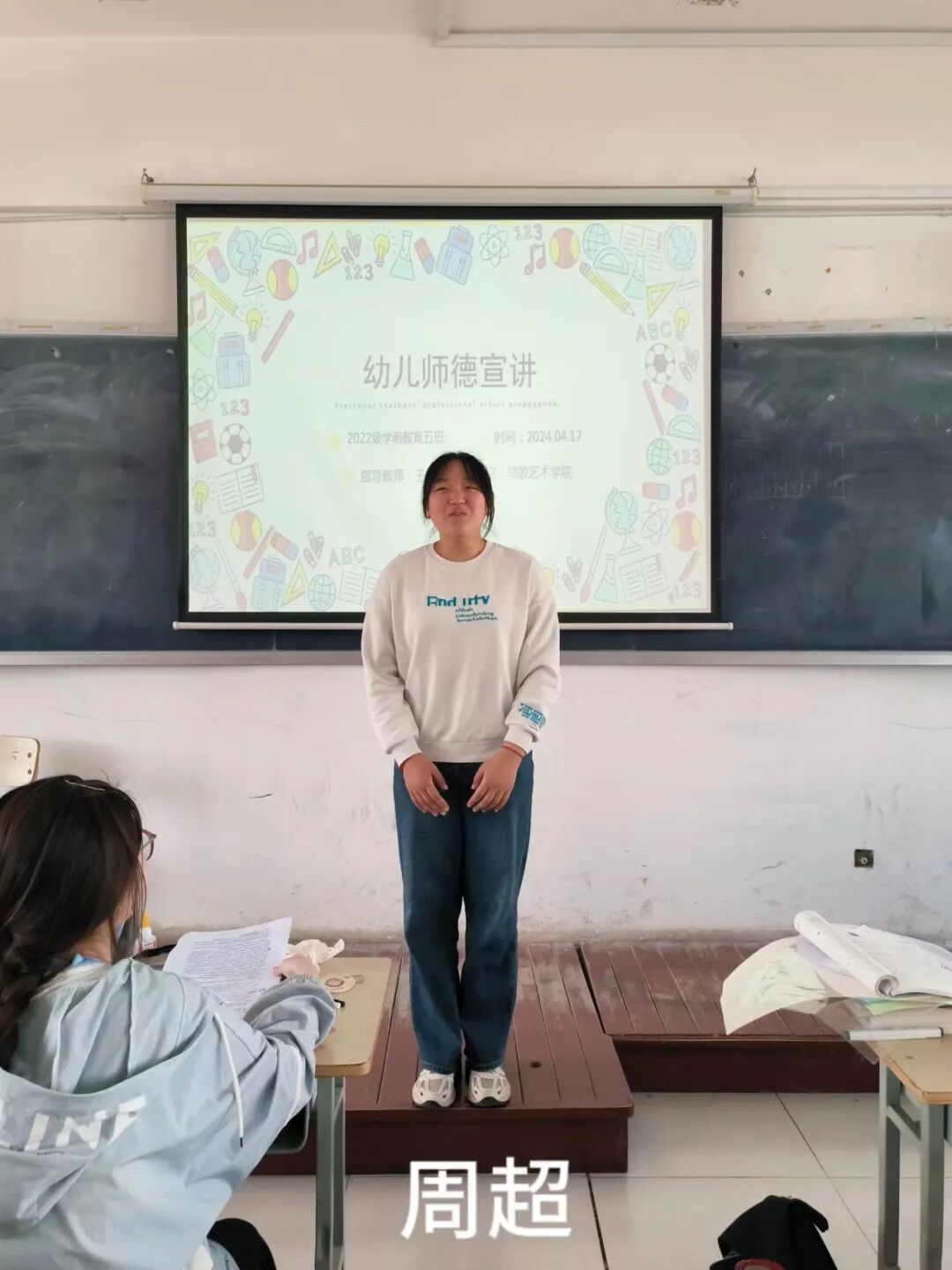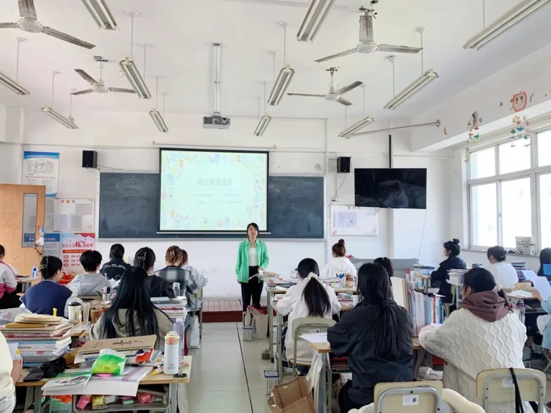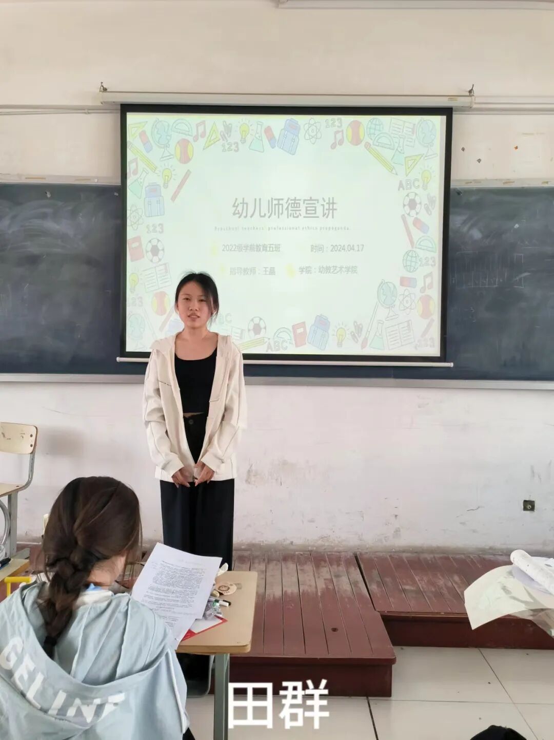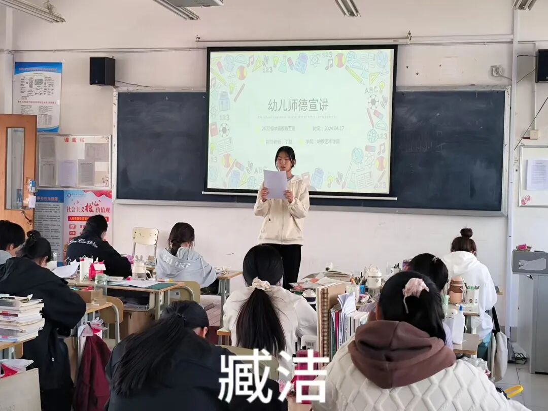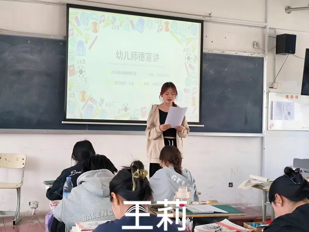 为推动学生们教师职业道德知识的掌握,完善道德品行,升华道德境界,更好地完成实习任务,4月17日上午,2022级学前教育5班开展了“树师德,扬师风”幼儿师德宣讲会。