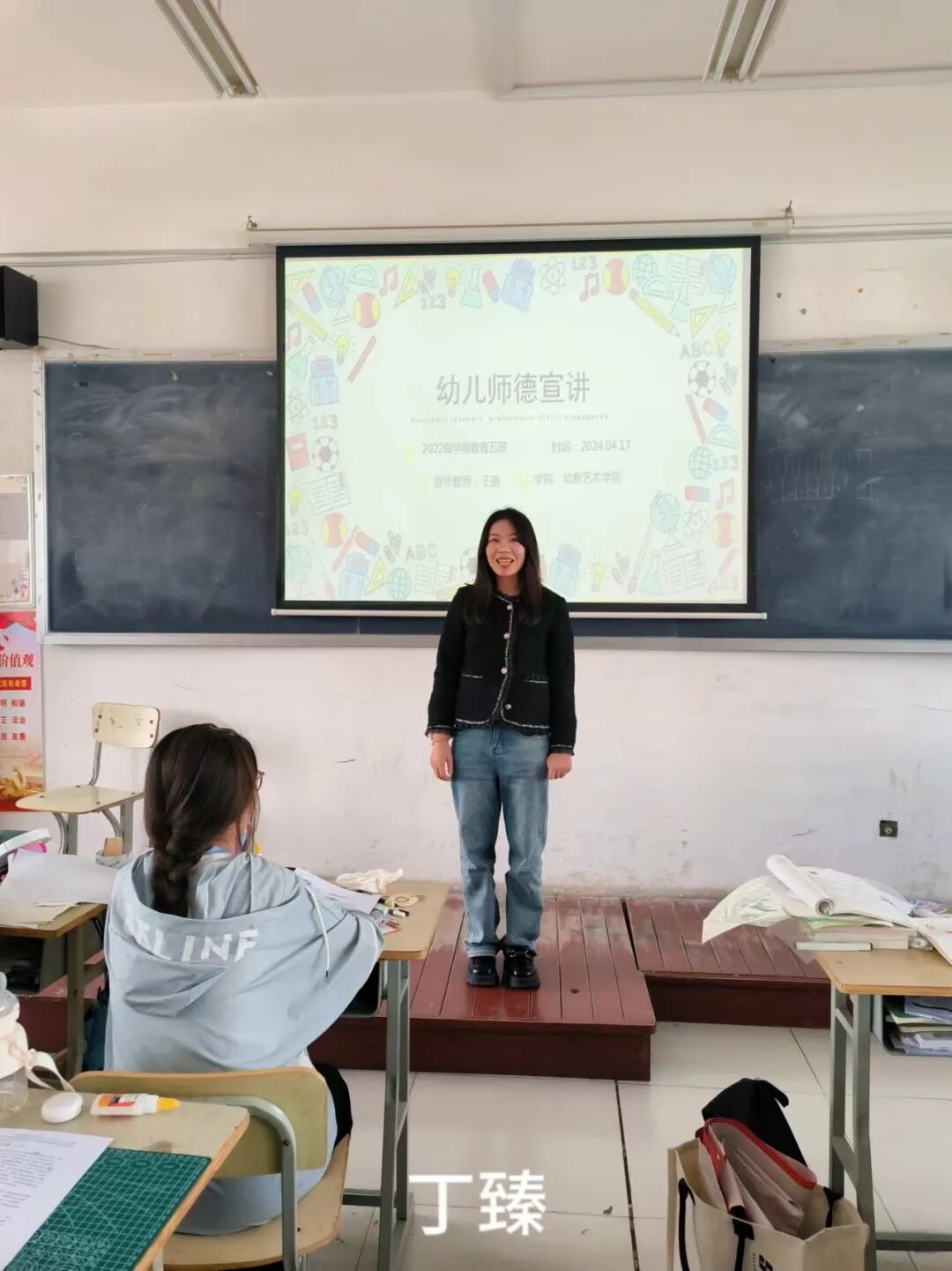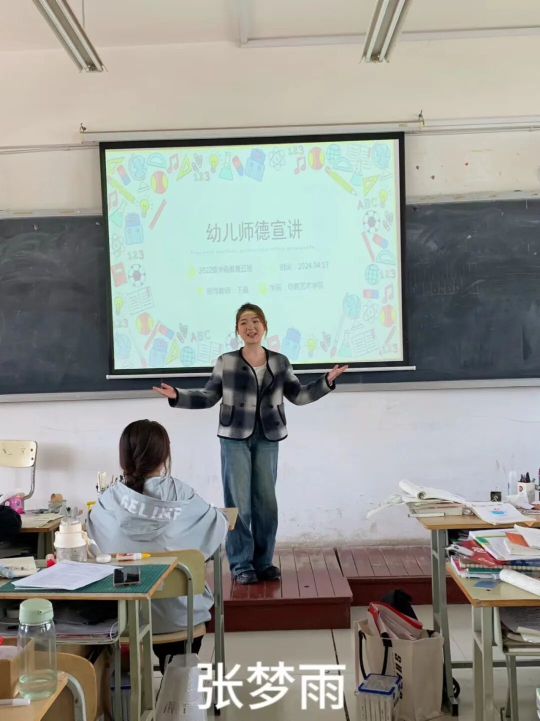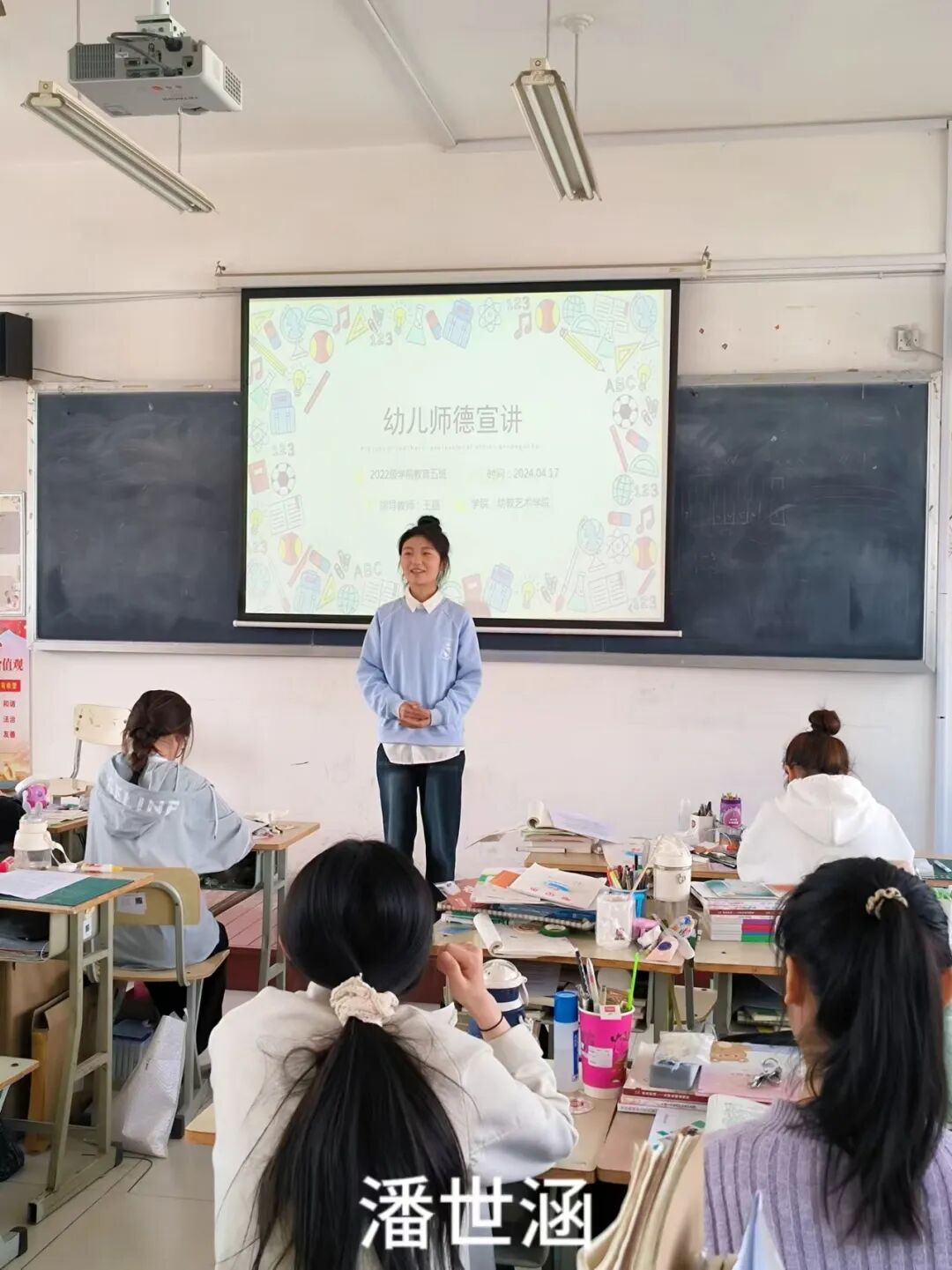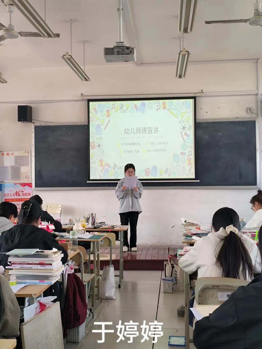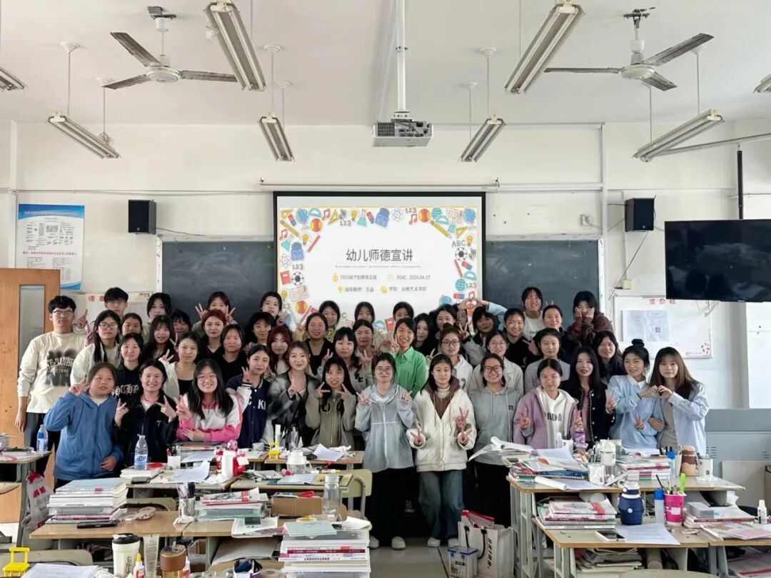 为推动学生们教师职业道德知识的掌握,完善道德品行,升华道德境界,更好地完成实习任务,4月17日上午,2022级学前教育5班开展了“树师德,扬师风”幼儿师德宣讲会。