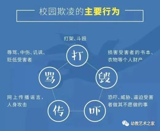 肢体欺凌:通过肢体动作去恐吓、伤害他人,如暴力推搡、拳打脚踢、抢夺或勒索财物等。言语欺凌:通过骚扰、辱骂性语言对他人进行伤害,如当面或背后羞辱、讥讽、嘲笑、诅咒、起外号等。社交欺凌:故意离间破坏同学之间的关系,如散播谣言、暴露他人隐私、损毁他人形象、孤立排挤他人等。