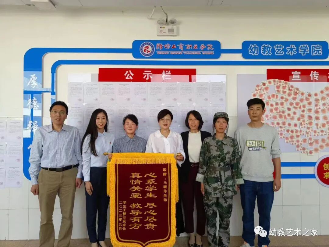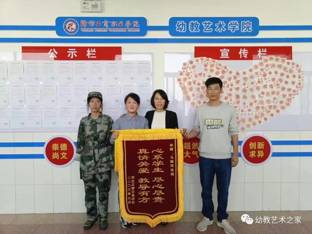 在此期间,学院领导和辅导员一起,始终坚守在一线。幼教艺术学院2023级学前教育一班辅导员马晓萍老师,一直在训练场地陪同学生训练,积极配合教官完成训练任务,主动帮助学生克服生活和军训中遇到的困难。工作中的马老师非常关注学生情绪,注重学生心理状况的调节与管理,在军训第一天结束时,马老师发现班里有同学因为不适应,情绪不稳定想要回家,在宿舍哭啼不止,马老师在本班班长的陪同下共同前往宿舍,对学生进行安抚,与学生谈心直至深夜。在与马老师谈心后,学生的情绪逐渐平稳下来,家长也不再焦急。学生的情绪稳定后迅速转变了自身思想,克服困难,积极投入到军训当中并被教官评为军训先进个人。家长感动于老师的热情与悉心教导,为学院送来锦旗,以表感谢。