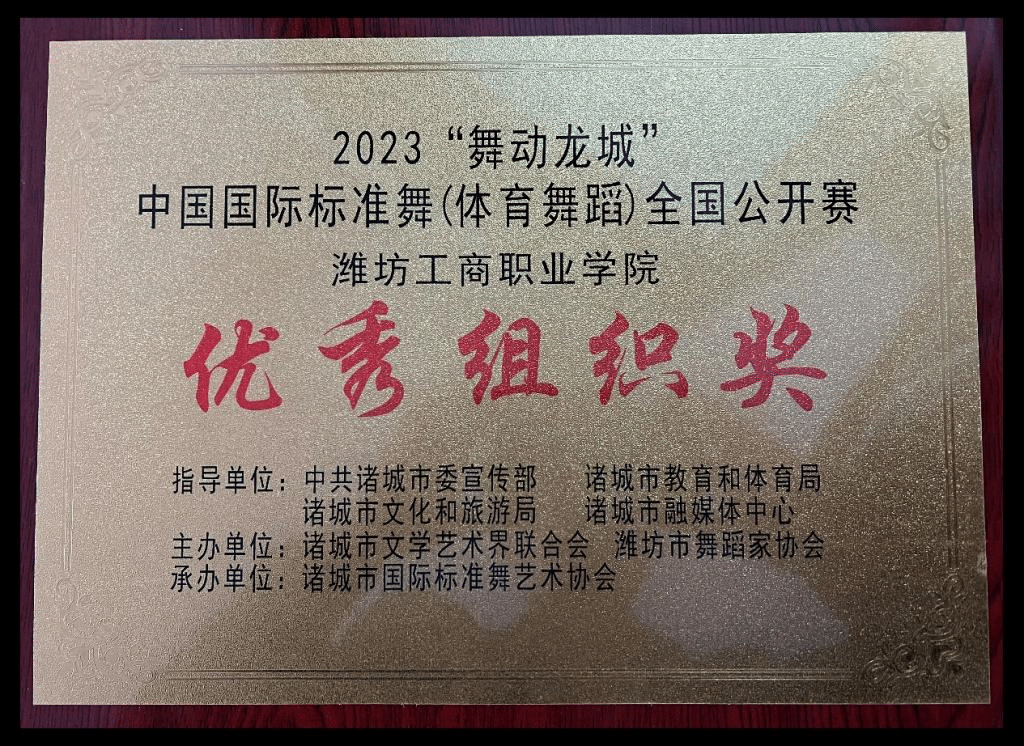 72023“舞动龙城”中国国际标准舞(体育舞蹈)全国公开赛在我市举行,10个地区的选手参加,我院选手在比赛中获奖50项,其中第一名4项,第二名8项,第三名8项,其余名次30项,幼教艺术学院获优秀组织奖、高等院校团体积分金奖。