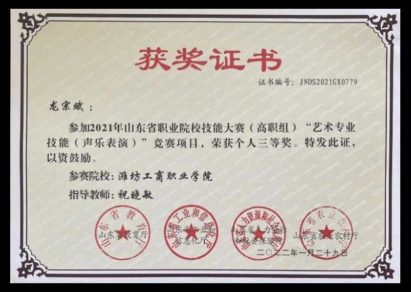 4、2021年山东省职业院校技能大赛声乐表演赛项中我校学生获得省个人三等奖的成绩。