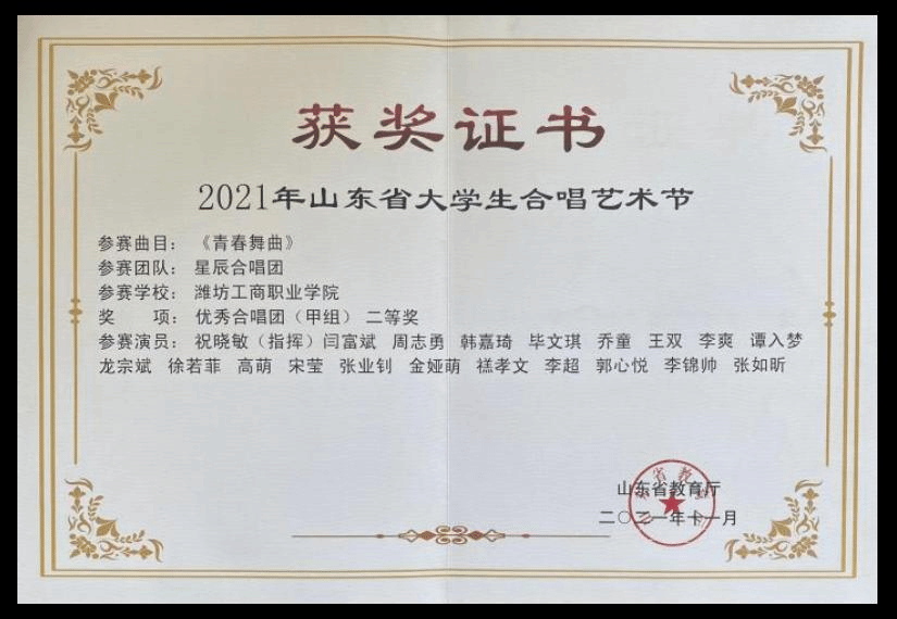 1、在教育教学中渗透红色文化,领略先辈精神,实现红色传承在2021年大学生合唱艺术节中阿卡贝拉作品《青春舞曲》获得省二等奖。