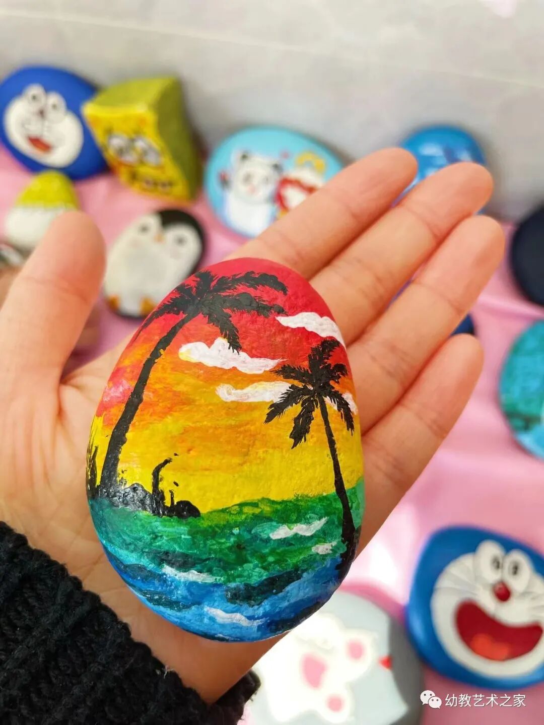 石头在大自然中既常见且平凡,但当同学们将它拾起,用颜料给它们换上新面貌,它们就变得独一无二,写意的风景山水,雅致的荷花,可爱的小猪佩奇一家人、多啦A梦、海绵宝宝、派大星......幅幅作品取材于自然,巧用其形、加以绘饰,既有天然之美,又具匠心之韵。