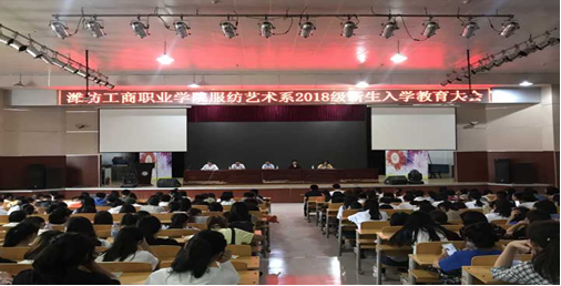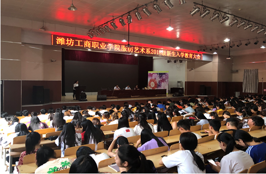 8月27日,潍坊工商职业学院服纺艺术系召开了2018级新生入学大会。大会在图书信息中心第一报告厅举行,系主任冯玉香,党支部书记扬明华,团支部书记苏茂刚,教学秘书王建梅,服装教研室主任林风秒,表演艺术教研室主任杨倩倩等出席并发表致辞,服纺艺术系全体新生参加了本次盛会。