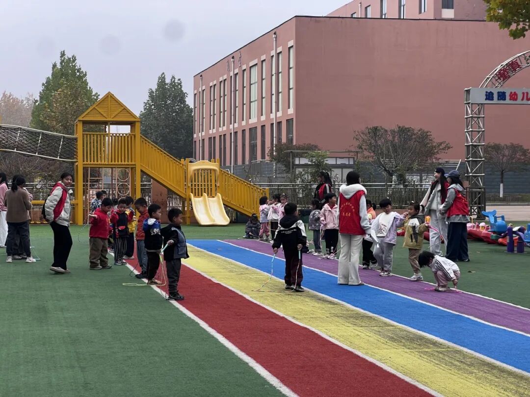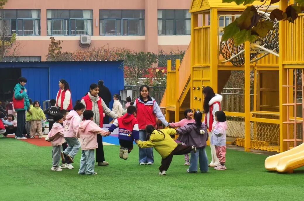 随后,志愿者们陪伴小朋友们来到室外活动场地,开启了欢乐的户外时光。大家化身“大朋友”,与孩子们一同参与跳绳,搭房子,集体游戏等活动,尽情奔跑、欢笑。志愿者们耐心引导胆小的小朋友勇敢尝试,细心呵护每一位孩子的安全,用温暖的笑容、亲切的话语与孩子们打成一片。阳光下,孩子们纯真的笑脸与志愿者们忙碌的身影相映成趣,构成了幼儿园里最温馨的画面。