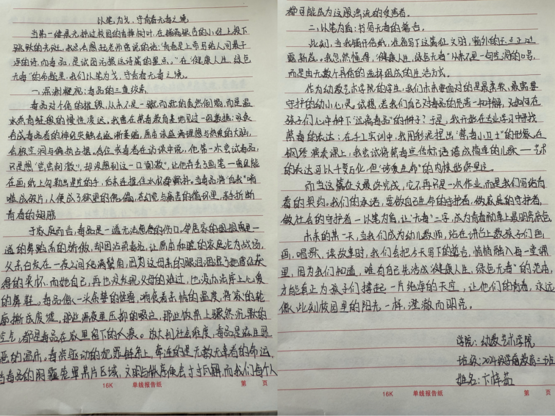此次活动既增强学生识毒防毒拒毒意识、提升法律自护能力,更让同学们立志将禁毒意识融入生活、主动学习;幼教艺术学院也将以此为新起点,持续开展多元禁毒宣传,推动教育常态化制度化,筑牢“健康人生,绿色无毒”的校园防护线,护航青春。