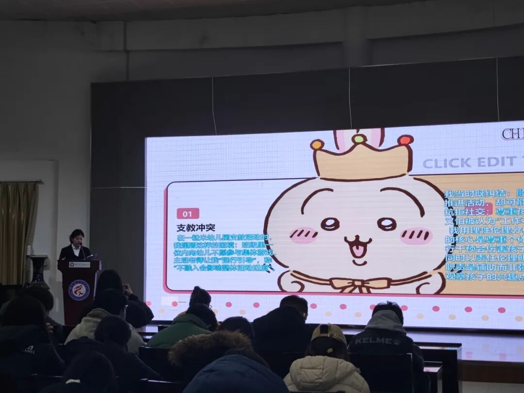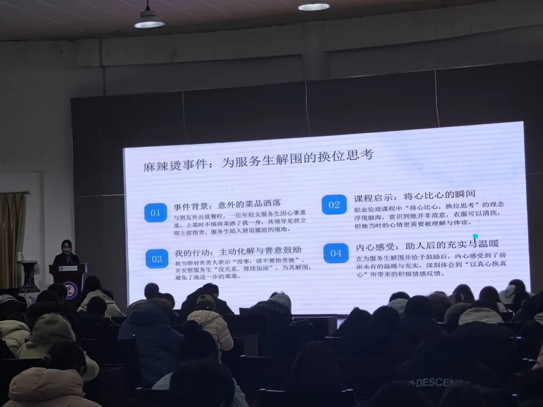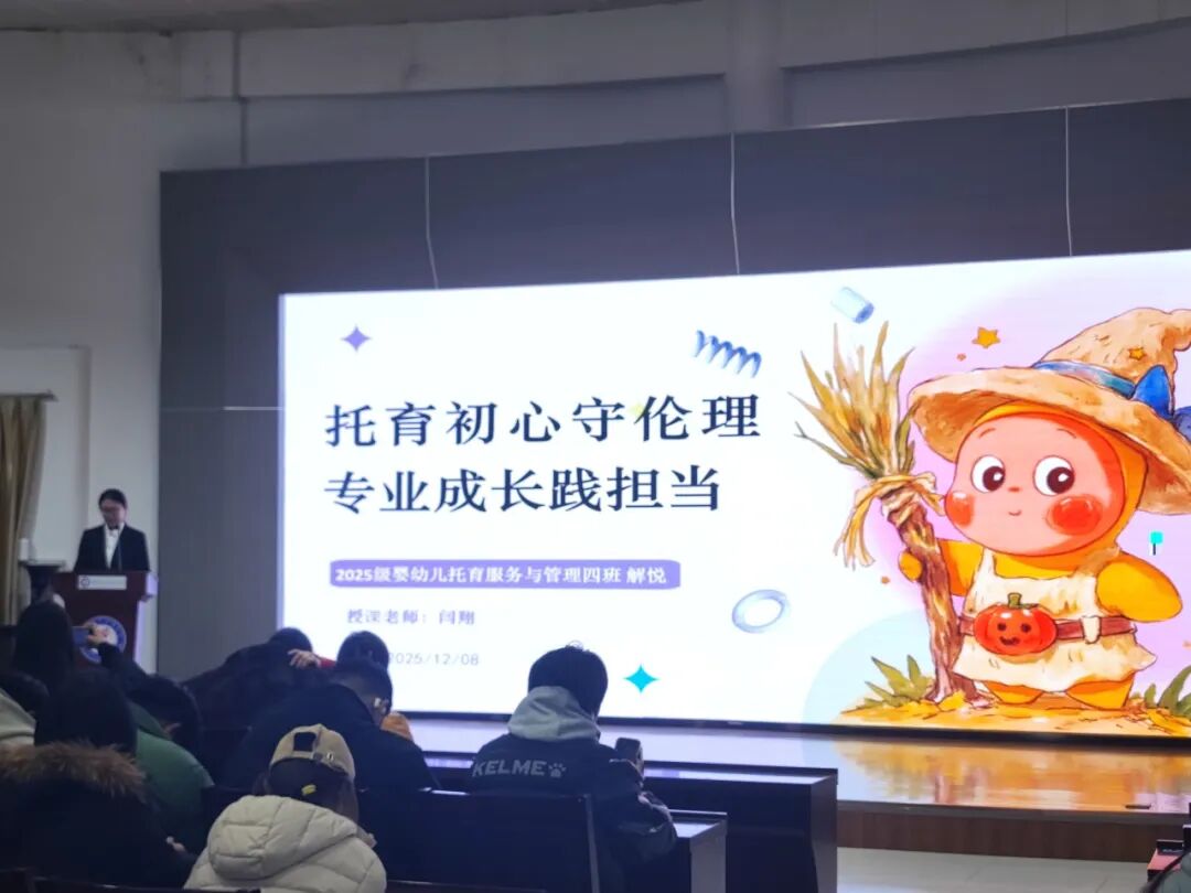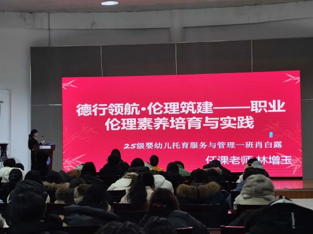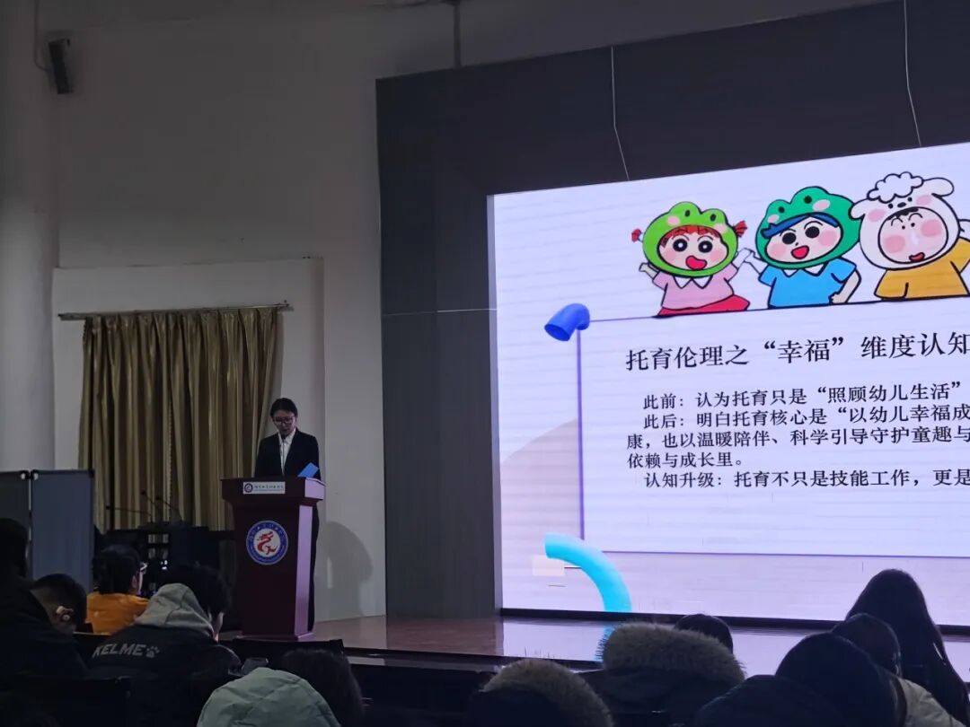 解悦同学以《托育初心守伦理,专业成长践担当》为主题展开分享。她结合自身学习与实践经历,拆解了“初心”与“伦理”的深层关联,讲述如何将职业伦理的要求融入专业学习的每一步,用担当诠释新时代学子对职业准则的坚守,真挚的分享赢得全场掌声。