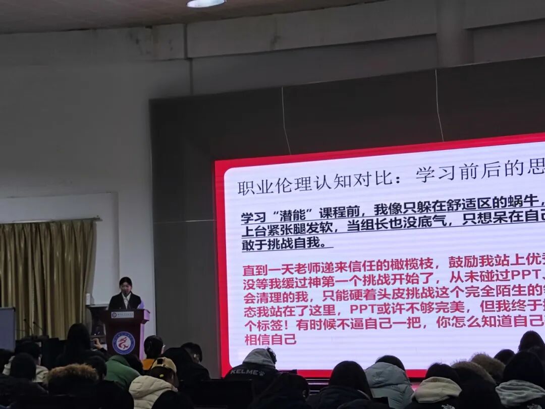 肖白鹭同学则围绕《潜能 实践 目的》展开分享,她提出,职业伦理是挖掘自身潜能、开展专业实践的根本导向,明确从业目的、坚守伦理底线,才能让实践之路走得更有方向、更有价值,其独到的思考引发了在场同学的共鸣。