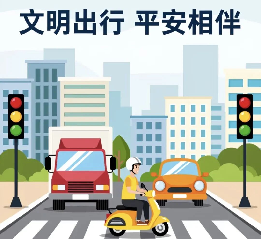 骑行电动车、自行车务必佩戴头盔,不逆行、不载人、不抢行。
